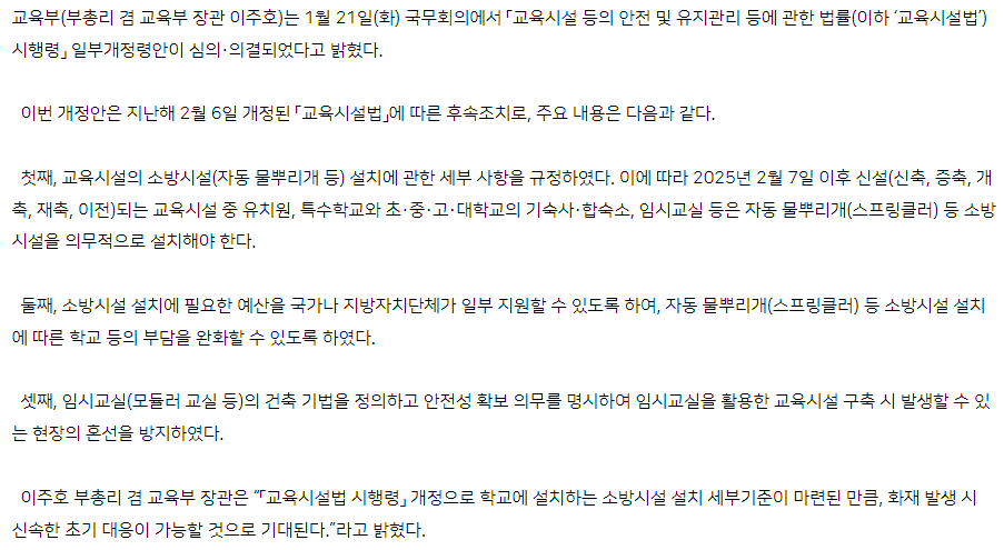 [교육부 01-21(화) 국무회의 종료 시 보도자료] 교육시설, 스프링클러 설치 의무화 시행.pdf (369.8 KB)