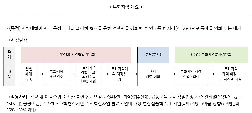 이번 특화지역 지정으로 비수도권 14개 광역지자체 중 12개 시도가 특화지역으로 운영된다. 특화지역은 지방대학의 경쟁력을 저해하는 각종 규제를 최대 6년간 면제 또는 완화해 주는 지방대학 맞춤형 규제특례 제도로 2021년 처음 도입되었다. 특화지역은 법령 개정 이전에도 각종 혁신에 필요한 제도를 신속히 운용할 수 있는 제도이지만, 지금까지의 적용사례는 9건(중복 제외시 6건)에 불과해 활성화에 한계가 있었다.